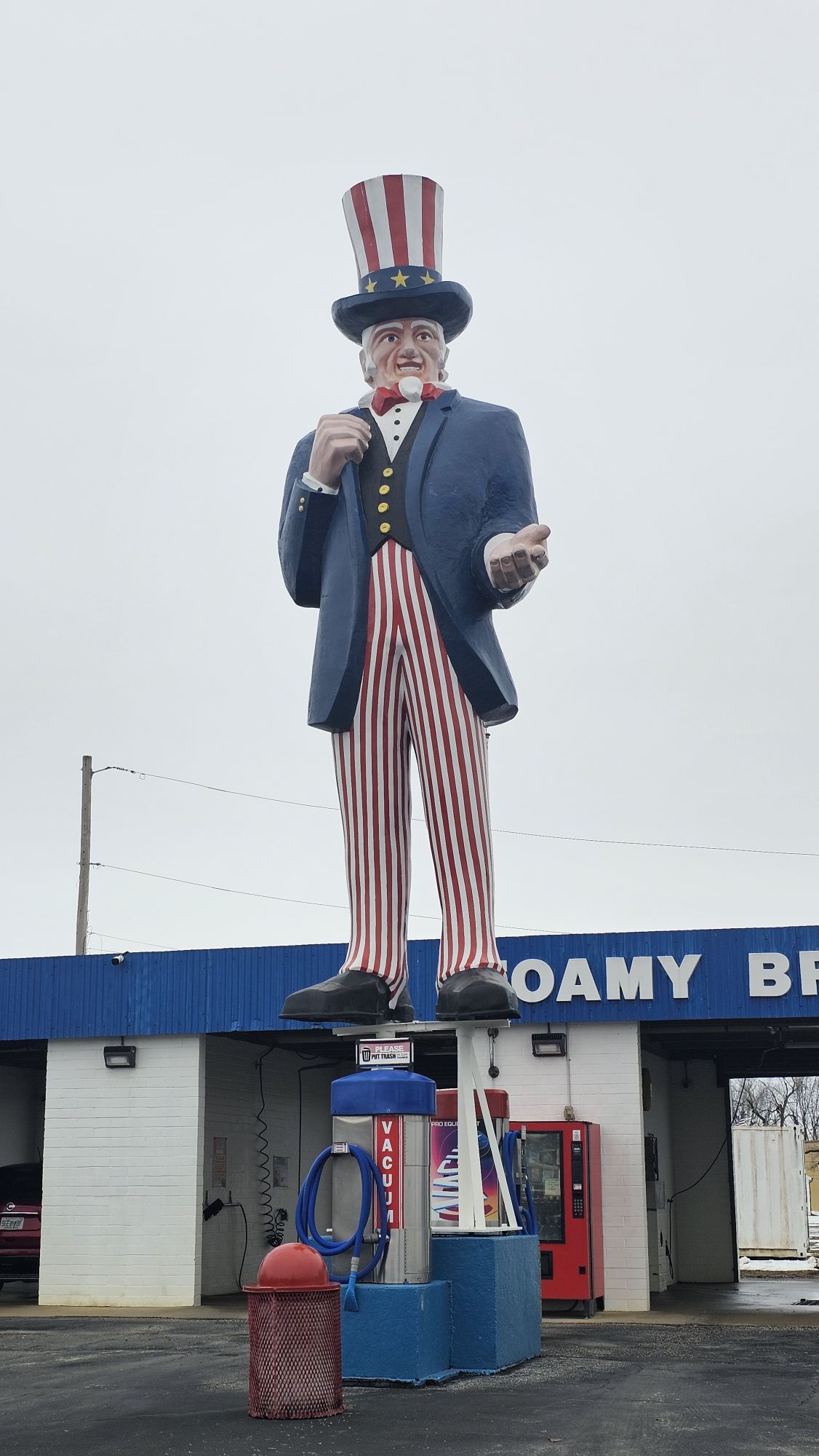 You may have seen our post about George Rogers Clark National Historic Park in Vincennes, IN(See our National Park Page if not). After we had left there, we went and found some roadside “attractions” in Vincennes and in Bloomington, IN. We first found an Uncle Sam figure that was standing tall over the entrance to a local car wash. I’m guessing Uncle Sam “wants you” to keep your car clean in Vincennes!