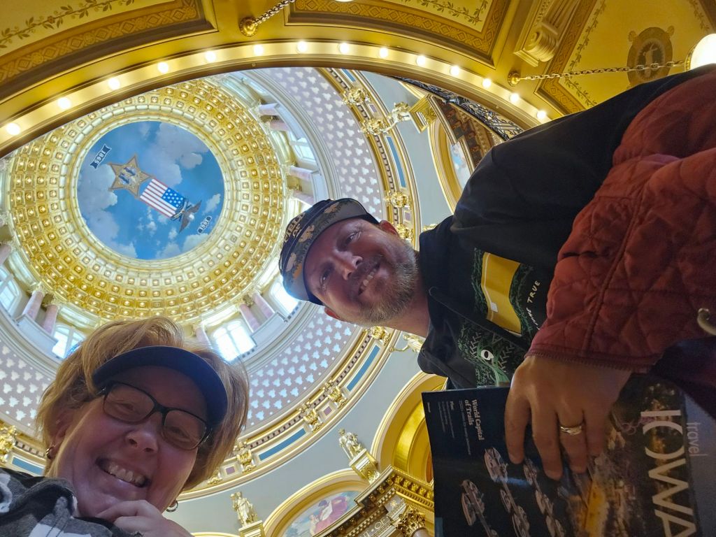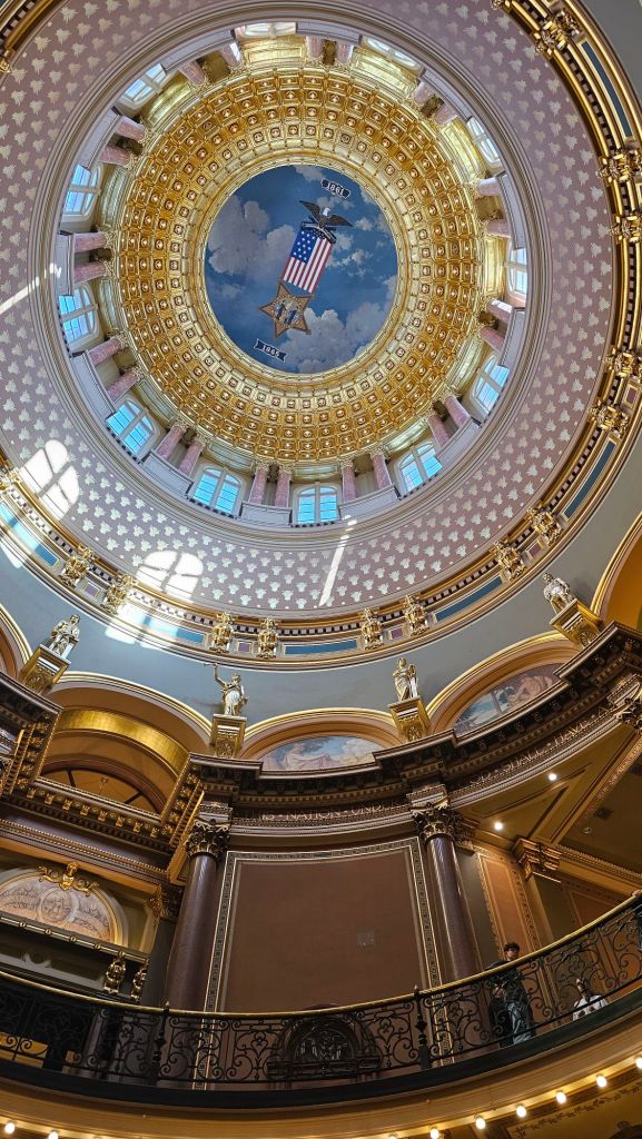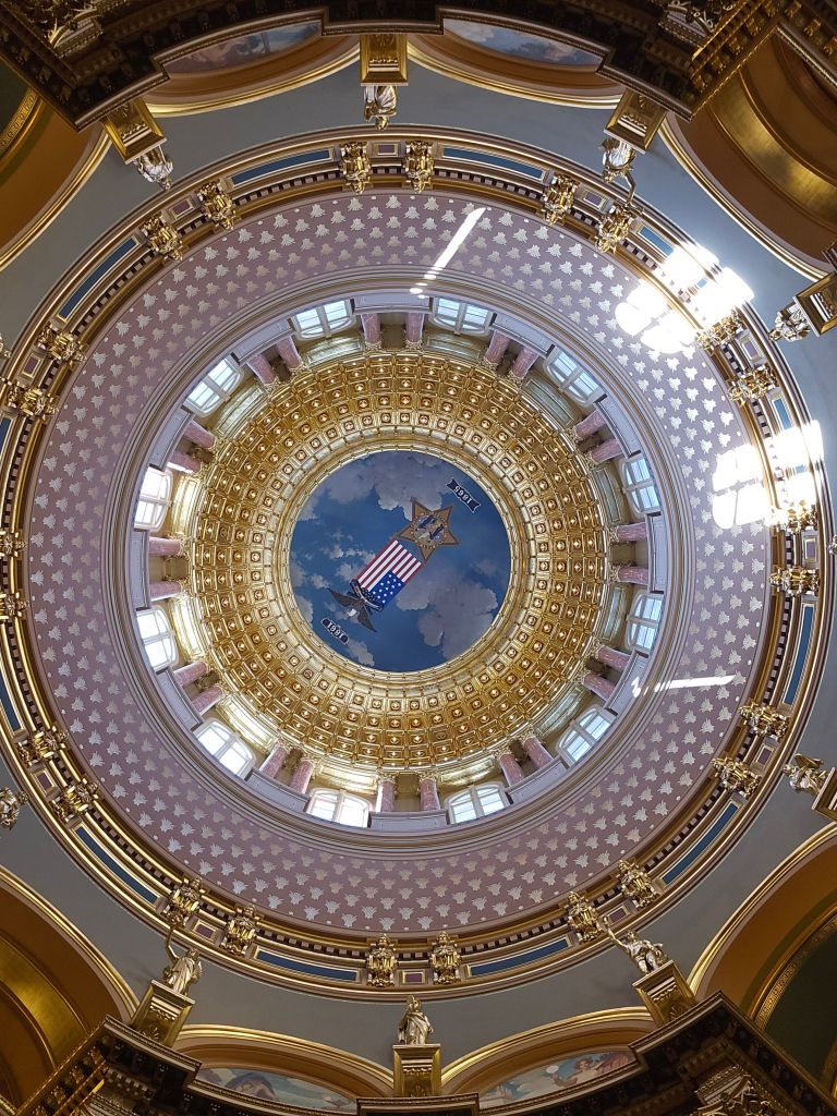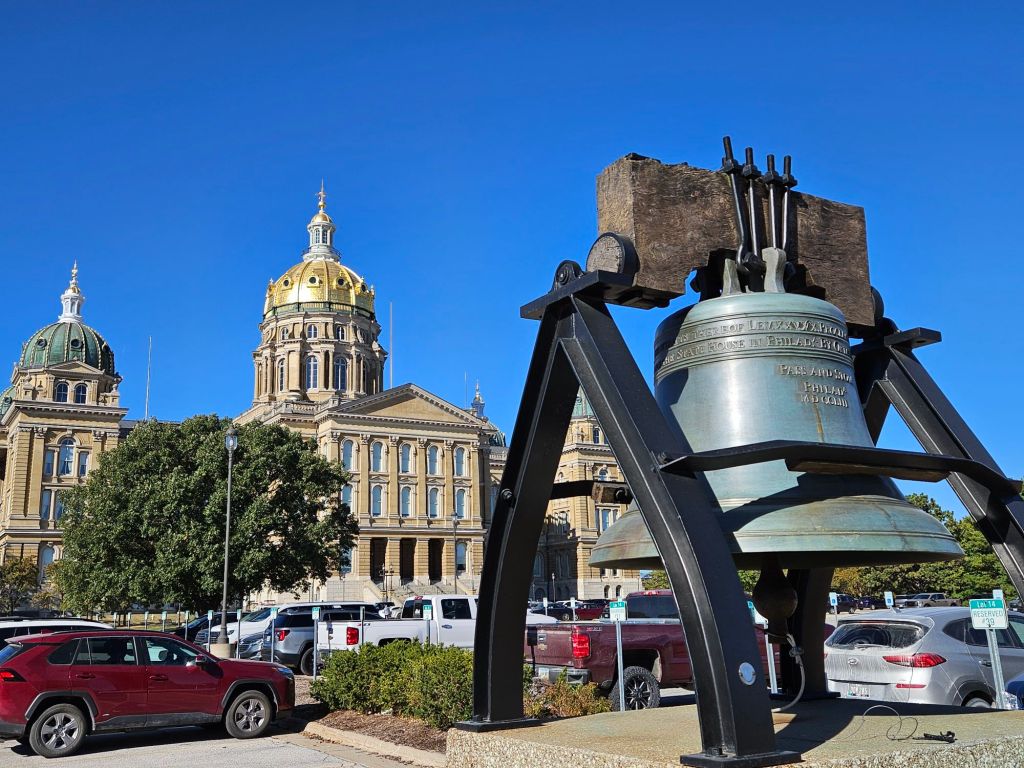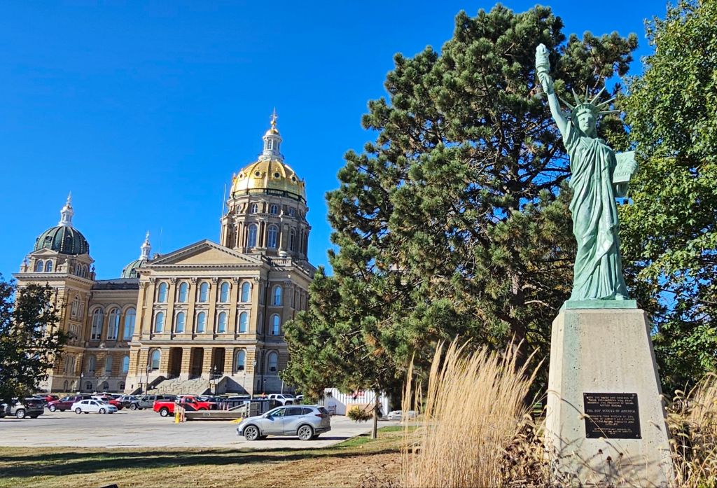 Located on the eastern side of downtown Des Moines, the Iowa statehouse is unique as it is the only capital with 5 domes. 23K gold-leaf gilding center dome rises 275 ft tall. It is built in the Renaissance Revival Style. In the west hall is a model of the U.S.S. Iowa battleship, a perfect 1:48 scale model that weighs 1,390 lbs. 18ft 7in.