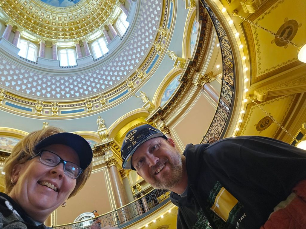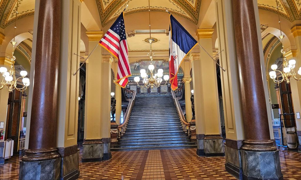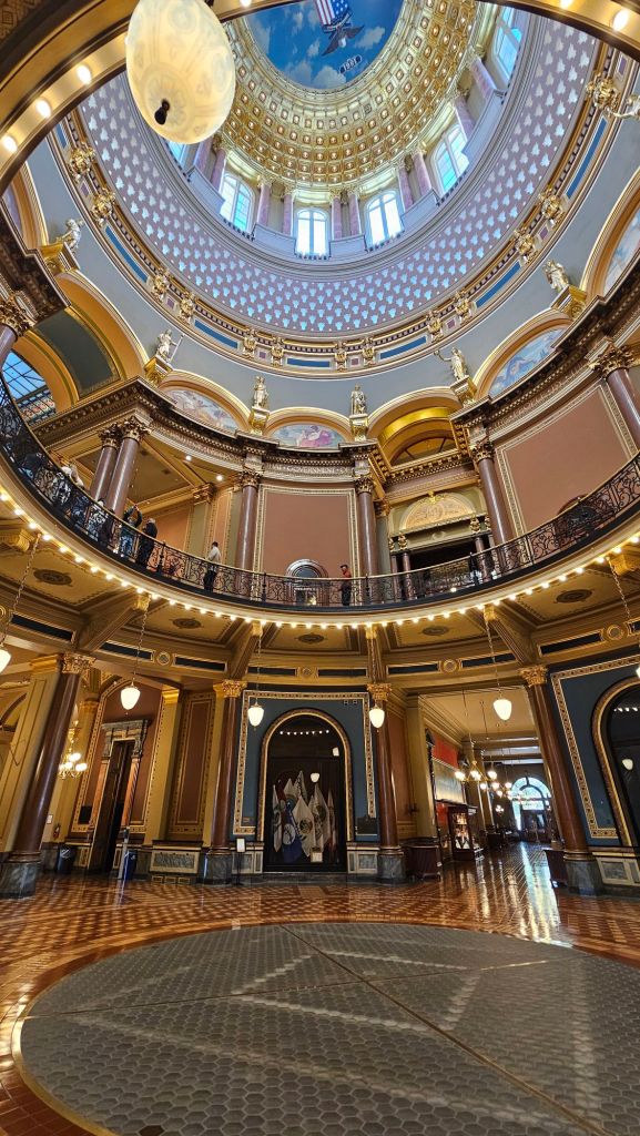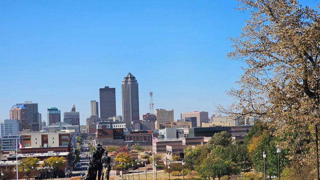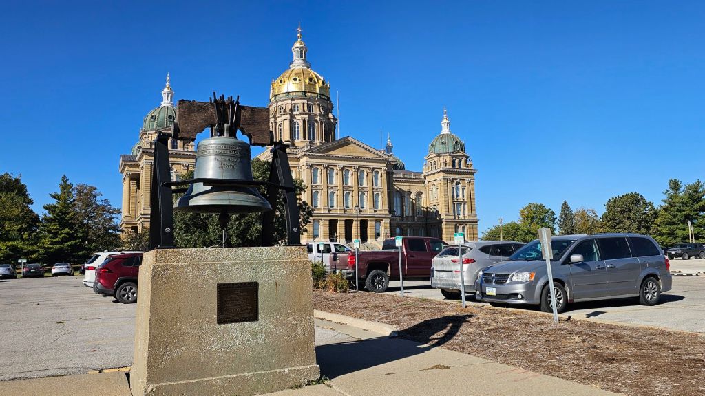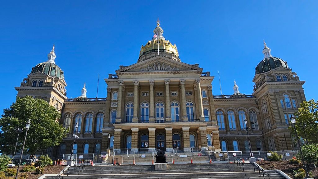 Located on the eastern side of downtown Des Moines, the Iowa statehouse is unique as it is the only capital with 5 domes. 23K gold-leaf gilding center dome rises 275 ft tall. It is built in the Renaissance Revival Style. In the west hall is a model of the U.S.S. Iowa battleship, a perfect 1:48 scale model that weighs 1,390 lbs. 18ft 7in.